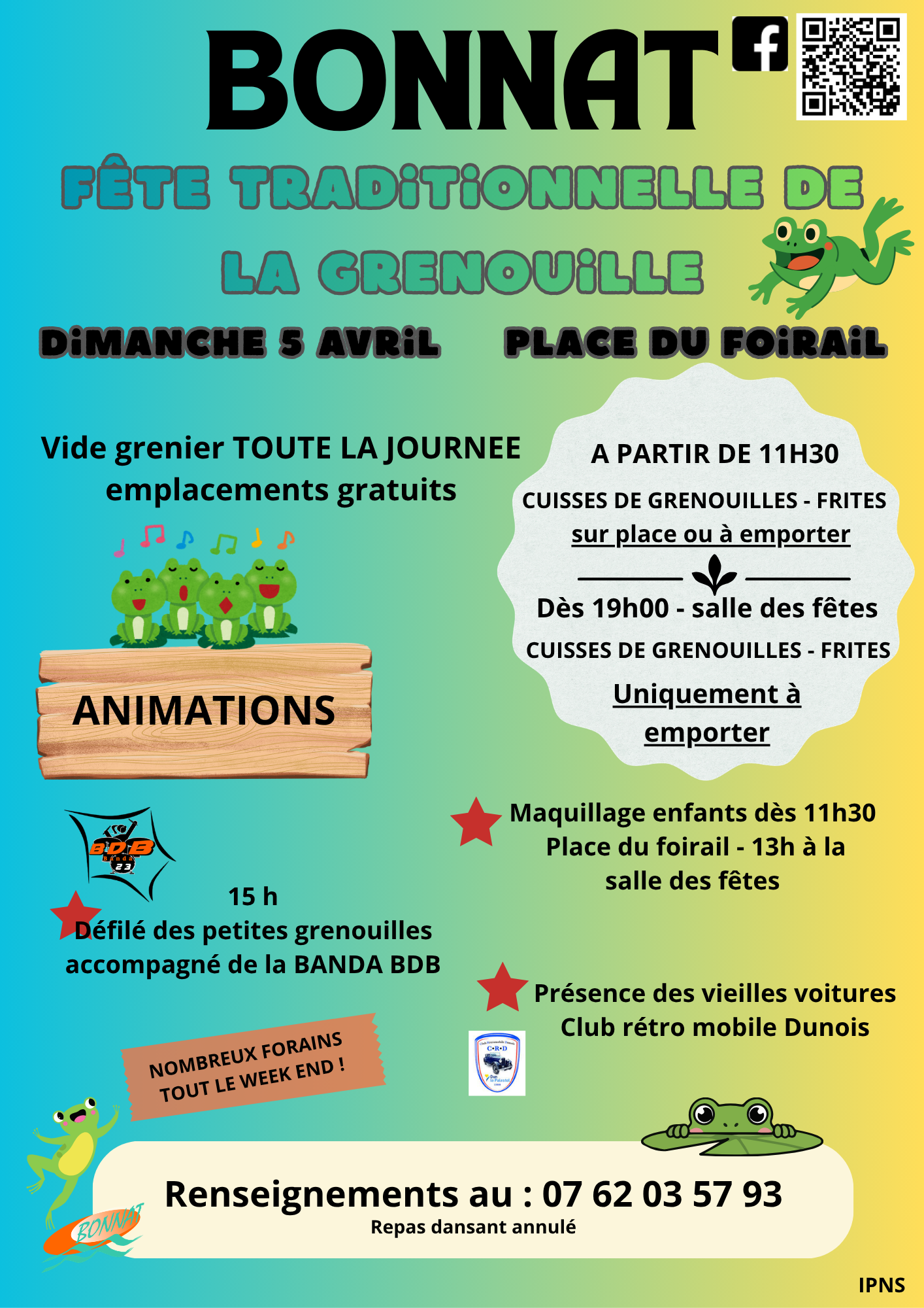 Agenda sorties Évènement annuel Manifestations À LA UNE ! ⨠ Fête de la grenouille Dimanche 05 AVRIL 🏠 Place du Foirail&🏠 Salle des fêtes SuivezComité des fêtes de Bonnatsur